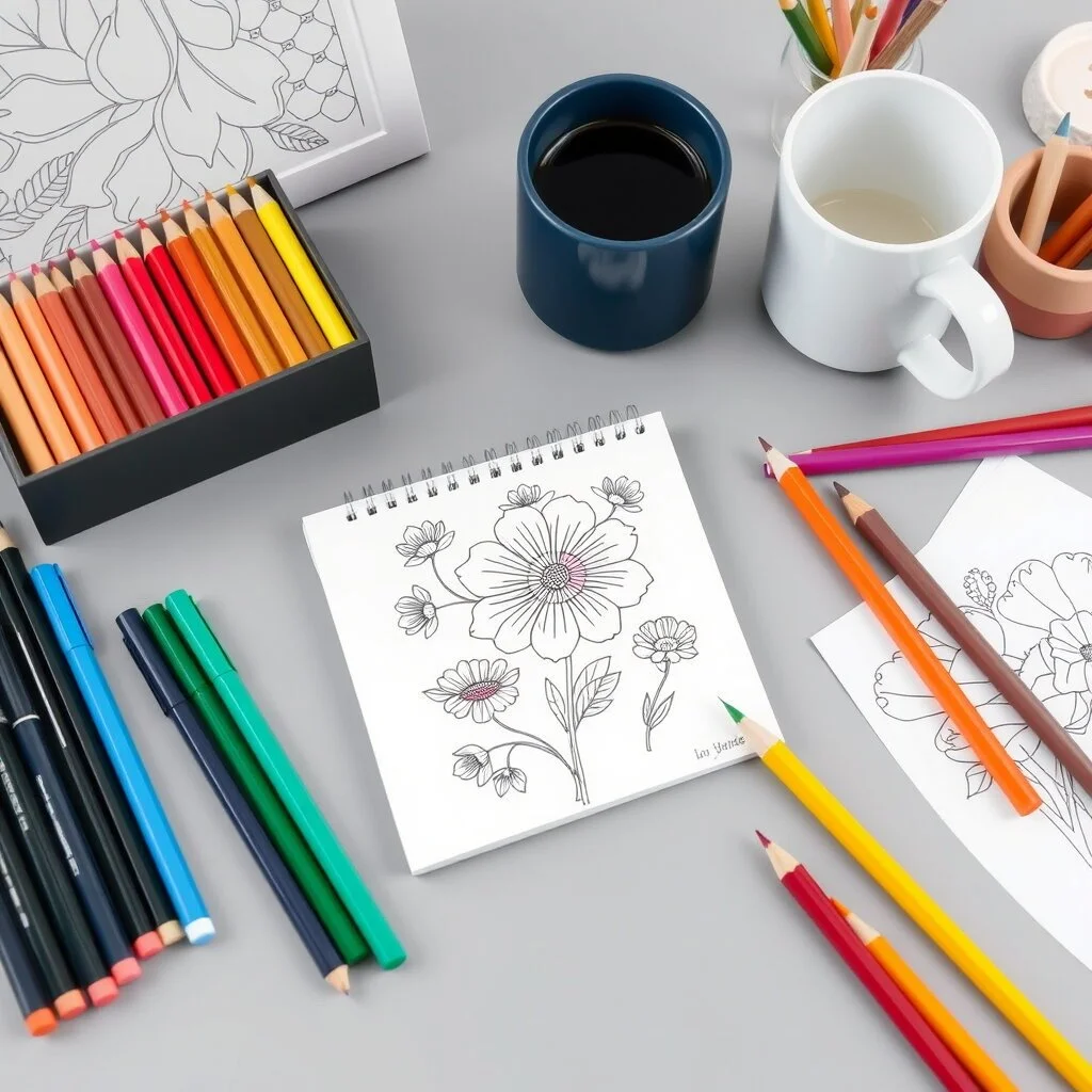 Colored pencils, gel pens, and fine-tip markers are recommended. If using markers, place a sheet of paper behind the page to prevent bleed-through.